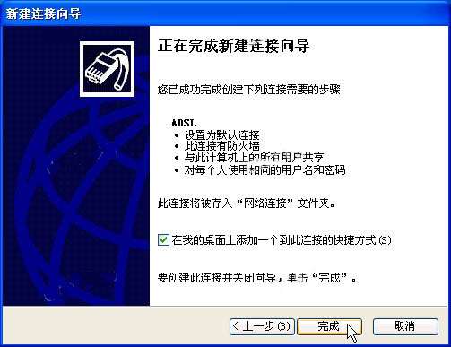 | 单击“完成”后,你会看到桌面上多了个名为“ADSL”的连接图标。 | ![]() |